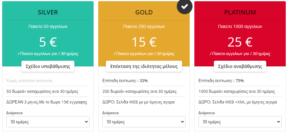 Υπαρχουν πακετα αγγελιων SILVER , GOLD , PLATINUM